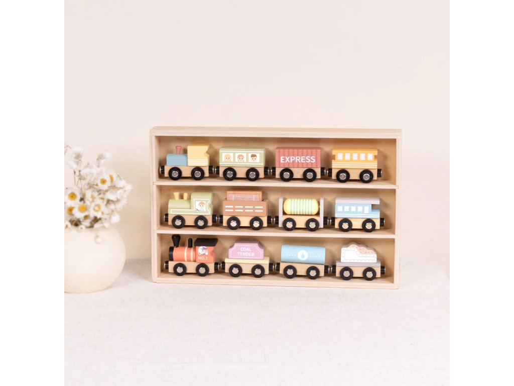 Drevené vláčiky Set 12 ks Pastel Hurá na cestu! Sada 12 drevených vláčikov v drevenej vitrínke v pastelových farbách zaujme všetkých nadšencov vlakov, ale aj milovníkov autíčok. Sada obsahuje 3 drevené mašinky a 9 rôznorodých osobných aj dopravných vagónov. Všetky sa dajú krásne spojiť pomocou magnetiek. Drevená vitrínka môže pri hre slúžiť ako stanica či parkovisko. Po hre do nej deti zase všetko upratajú.Vláčiky na drevenú vláčikodráhu Deti sa s nimi ale môžu hrať aj samostatne. Zlepšujú si jemnú motoriku, koordináciu ruka-oko a rozvíjajú si predstavivosť. Pri hre v skupine si trénujú svoje sociálne a komunikačné zručnosti. Vláčiky Sú vyrobené z dreva z udržateľného lesníctva a s ohľadom na bezpečnosť detí.