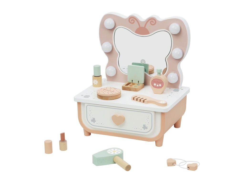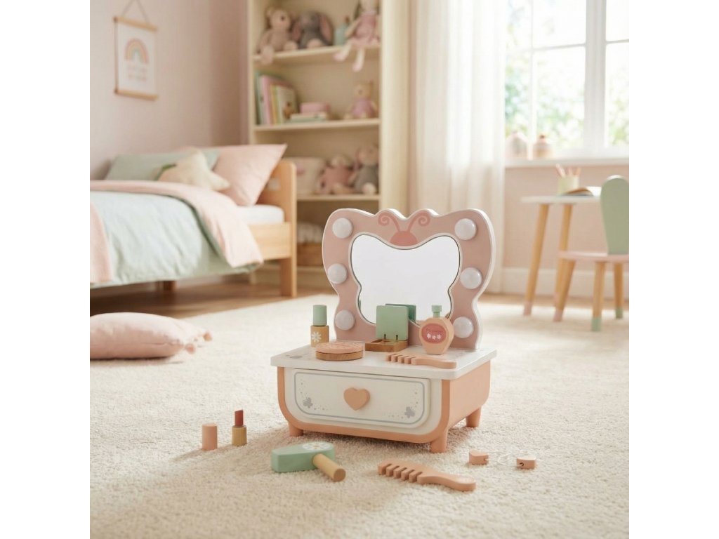 Toaletný stolík MotýlikDrevený toaletný stolík pre malé parádniceKaždá malá princezná si zaslúži svoj kútik krásy! S týmto dreveným toaletným stolíkom Motýlik od Tooky Toy sa sny o česaní, maľovaní a parádení stanú skutočnosťou. Tento toaletný stolík je viac než len hračka – je to priestor, kde sa detská fantázia mení na skutočné príbehy o kráse, starostlivosti a radosti. Perfektný doplnok do detskej izby, ktorý prinesie úsmev a iskru do každého dňa.Hra, ktorá rozžiari fantáziu a sebadôverupodnecuje tvorivosť, predstavivosť a sebaistotupodporuje rozvoj jemnej motoriky a sociálnych zručnostíideálny pre hry na princezné, mamičky či kaderníčkysúčasťou sú zrkadlo, zásuvky a kozmetické doplnkyvyrobené z kvalitného dreva s bezpečnými, netoxickými farbamikrásny darček pre dievčatá od 3 rokov