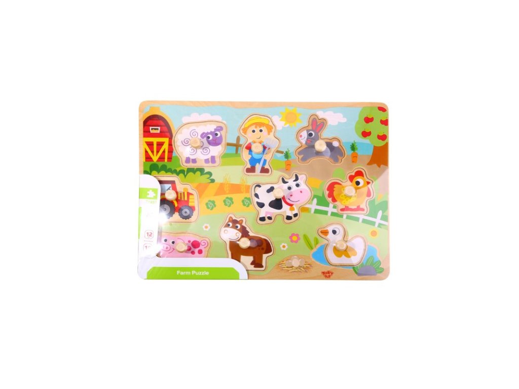 Vkladacie puzzle Farma Deti sa zoznámia so životom na farme. Tematické puzzle obsahuje podkladovú dosku a 9 drevených dielikov – kravičku, koňa, prasiatko, ovečku, kačičku, kohúta, zajaca, farmára a traktor. Je odolné, vyrobené z udržateľného dreva, ručne natreté farbami na vodnej báze a fixované lepidlom bez formaldehydu.Vkladacie puzzle rozvíja jemnú motoriku Zlepšuje tiež koordináciu oko-ruka, trpezlivosť a schopnosť samostatne sa hrať. Vďaka veľkým dielikom s úchytkami je vhodné už pre deti od 18 mesiacov.