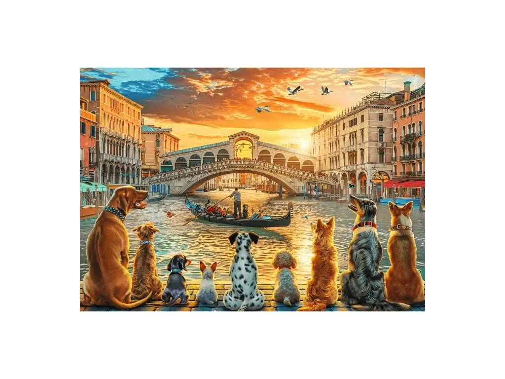Puzzle s 1 000 dielikmi Psy v Benátkach zobrazuje psy pri kanáli počas západu slnka. Po zostavení vytvorí obrázok s rozmermi 683 x 480 mm.