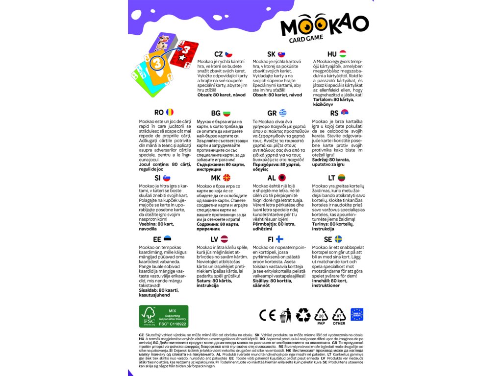 MooKao je dynamická kartová hra. Vašou úlohou je čo najskôr sa zbaviť svojich kariet z ruky. Ako na to? Vyložte zodpovedajúce karty a sťažte hru súperom tým, že na nich budete hrať špeciálne karty.Vek: 5+