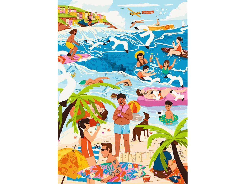 Puzzle In the Fever of Summer ukazuje, ako ľudia bezstarostne trávia svoj voľný čas na pláži. Po usporiadaní sa vytvorí obraz s rozmermi 683x480 mm.
