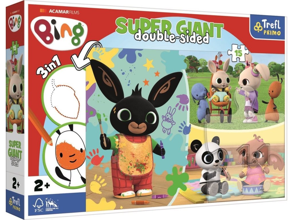 Tri hry v jednom produkte. Puzzle s 15 veľmi veľkými dielikmi pre najmenšie deti (od 2 rokov). Na zadnej strane puzzle je omaľovánka a jednoduchá hra s vyfarbovacími prvkami, s obrázkami obľúbených animovaných postavičiek.