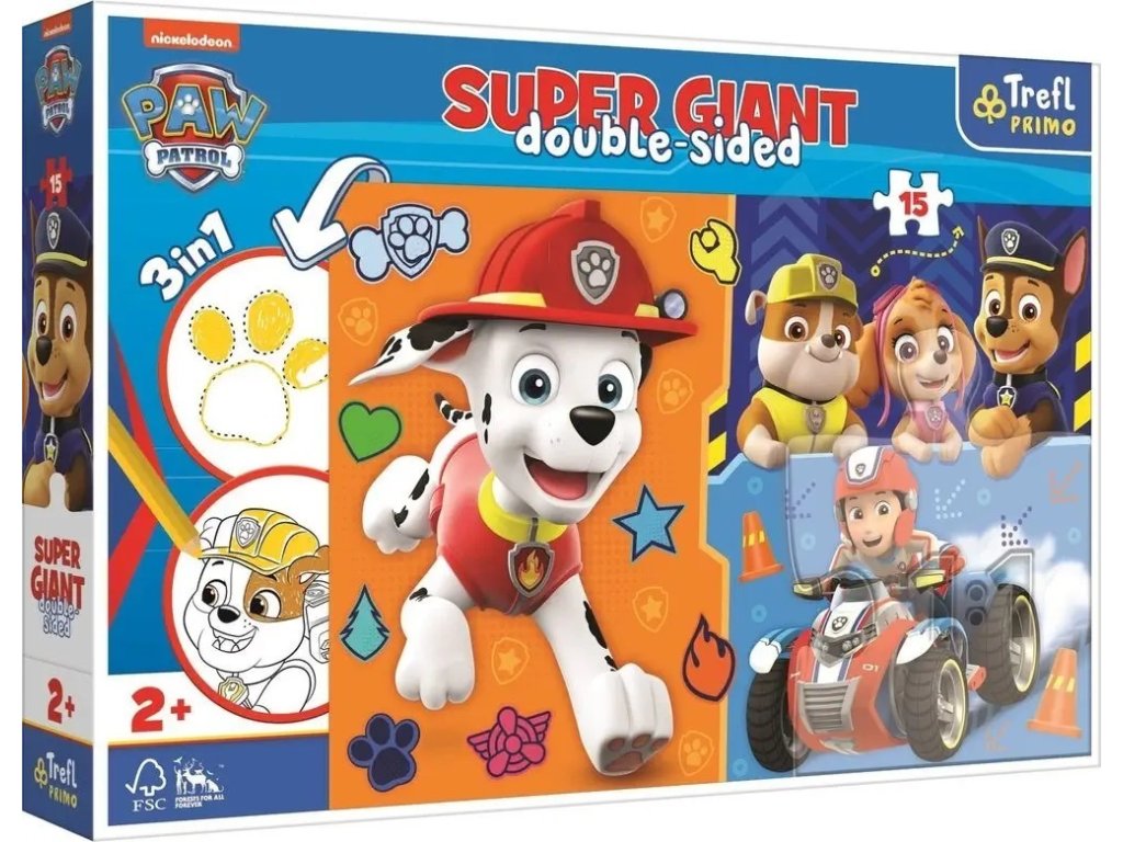 Tri hry v jednom produkte. Puzzle s 15 veľmi veľkými dielikmi pre najmenšie deti (od 2 rokov). Na zadnej strane puzzle je omaľovánka a jednoduchá hra s vyfarbovacími prvkami, s obrázkami obľúbených animovaných postavičiek.