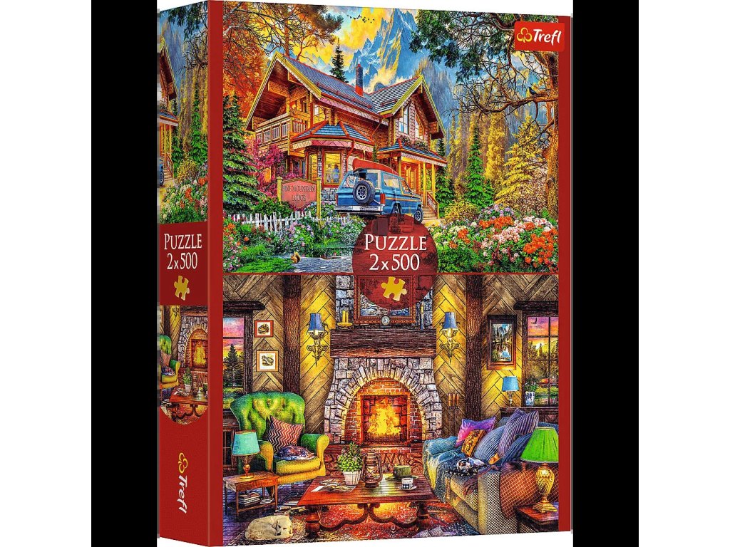 Puzzle 2x500 sú dve 500-dielne puzzle v jednom balení ! Výlet do hôr je skladačka zobrazujúca dom na pozadí hôr a interiér chaty s krbom. Každá skladačka vytvorí obrázok s rozmermi 480x340 mm.
