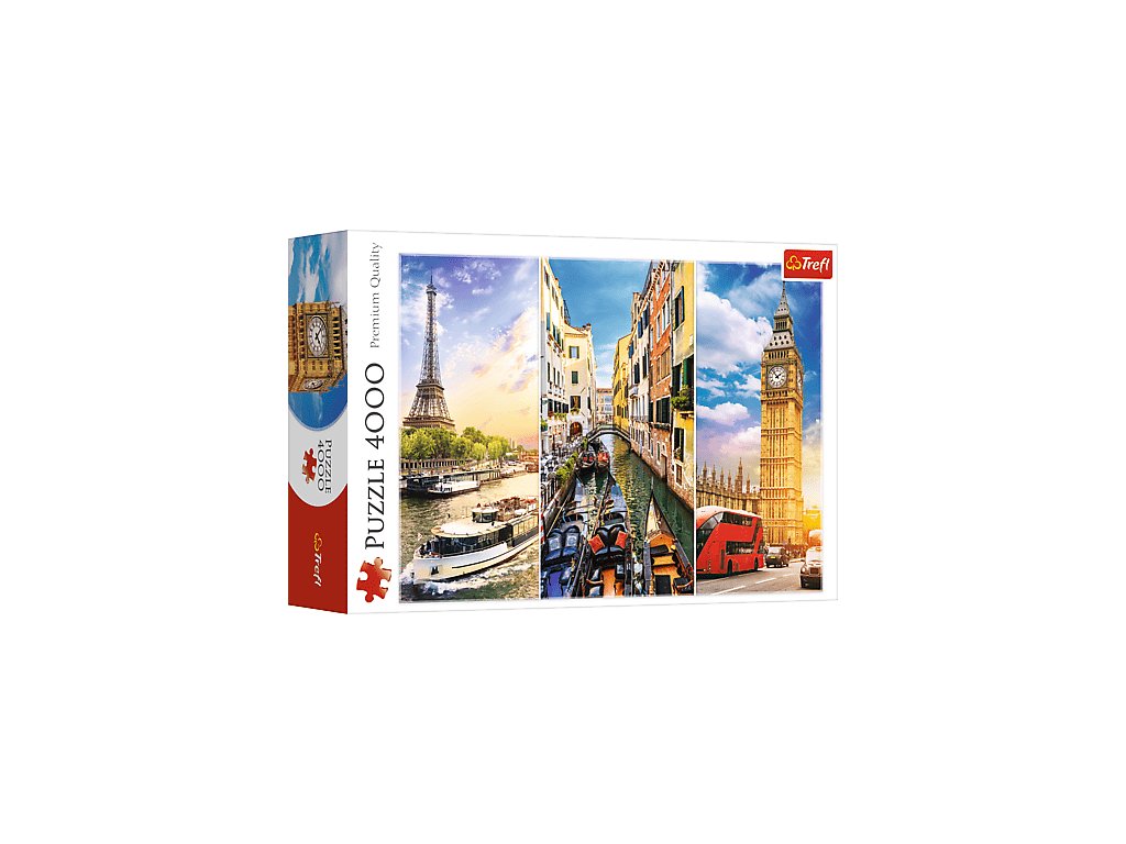 Trefl Puzzle 4 000 nájdete pohľad na tri európske mestá: Paríž, Benátky a Londýn Po položení sa vytvorí plagát s rozmermi 136 x 96 cm. Výrobok bol vyrobený z vysoko kvalitných materiálov pomocou špeciálneho kalandrovaného reflexného papiera, ktorý uľahčuje stohovanie.Produkt bol vyrobený v Poľsku a na výrobu boli použité ekologické materiály.