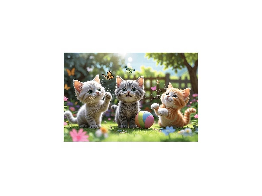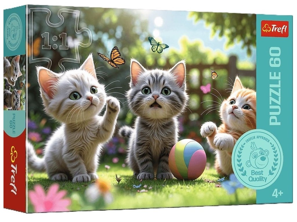 Tri mačiatka sú puzzle pozostávajúce z 60 prvkov, navrhnuté pre malých fanúšikov zvierat. Puzzle zobrazujú malé mačiatka, ktoré pozorujú farebné motýle. Po poskladaní skladačky vznikne obrázok s rozmermi 330 x 220 mm.