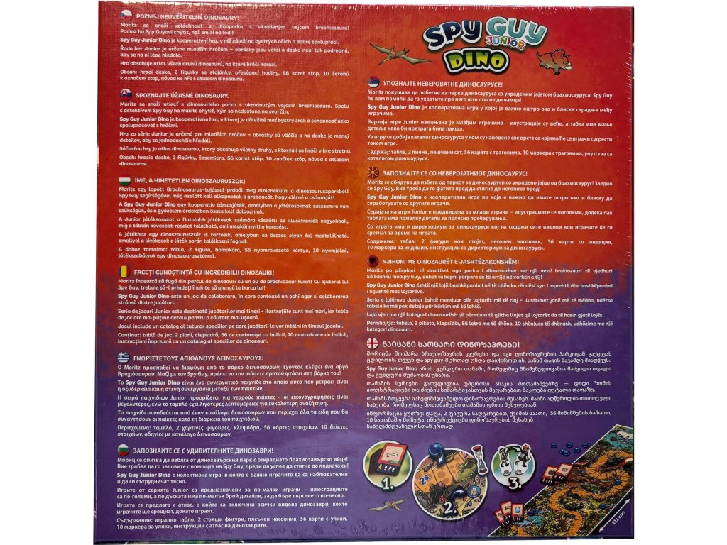 Spy Guy Junior Dino je kooperatívna hra, v ktorej záleží na bystrých očiach a dobrej spolupráci. Moritz sa snaží upláchnuť z dinoparku s ukradnutým vajcom brachiosaura Pomôž ho Spy Guyovi chytiť, než zmizne na lodi!