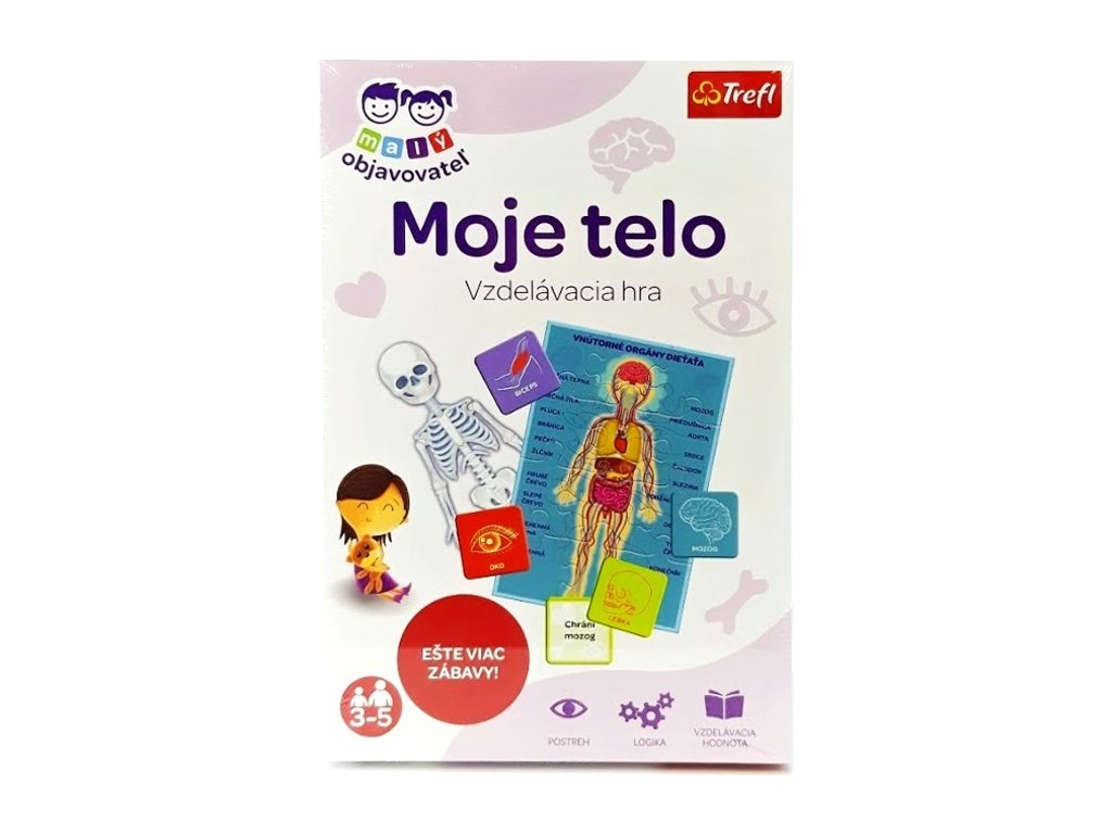 Trefl vzdelávacia hra Moje telo Vzdelávacia hra Moje telo je jednoduchá hra pre predškolákov, v ktorej sa učia o ľudskom tele. Pri hre sa naučia názvy jednotlivých častí tela, vnútorných orgánov , kostí a svalov. Vedomosti, ktoré deti pri hre získajú, sú ideálne prispôsobené ich veku. Balenie obsahuje: 4 hracie dosky s puzzle, 24 žetónov, návod s množstvom herných nápadov Séria Malý Objavovateľ