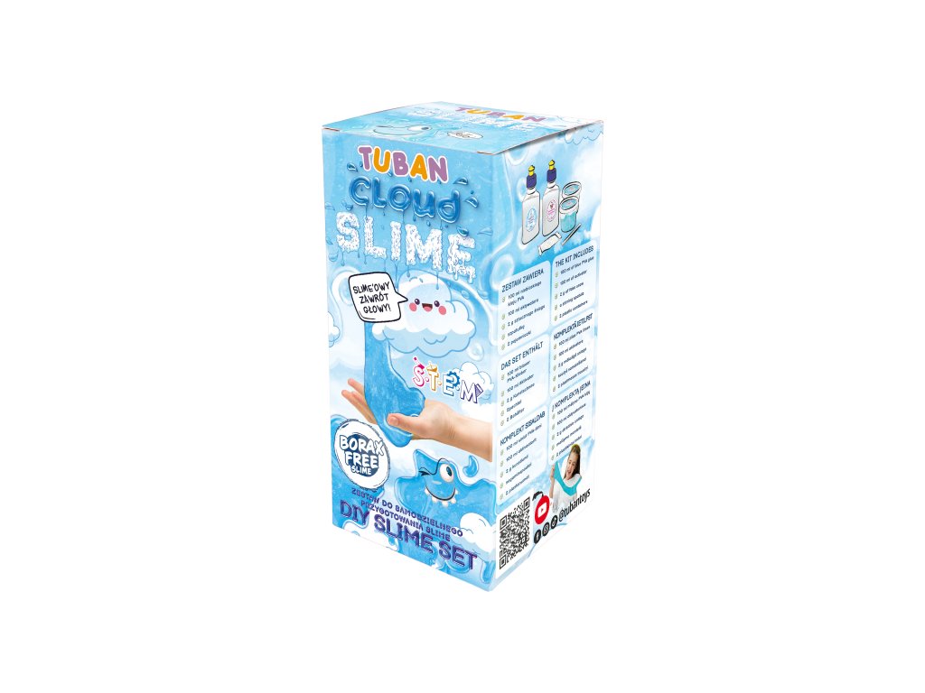 DIY Slime Sada na výrobu slizu Obláčik Vyrobte si svoj vlastný sliz nadýchaný ako obláčik Skvelá aktivita pre deti, ktoré radi experimentujú. V tejto sade nájdete všetko, čo na výrobu kvalitného slizu potrebujete. Vďaka špeciálnej prísade - umelému snehu bude mať sliz neuveriteľnú jemnosť a nadýchanosť a bude vám pripomínať obláčik. Hra so slizom je ideálna na rozvoj jemnej motoriky, zmyslového vnímania a podporuje u detí kreativitu.Sada obsahuje:100 ml modrého PVA lepidla,100 ml aktivátora,2 g umelého snehu,špachtľu,nádobu.Zábavný, edukačný, aj relaxačný Pre deti môže byť manipulácia so slizom upokojujúca a relaxačná. Je to skvelý spôsob, ako si oddýchnuť a znížiť stres po náročnom dni. Objavte všetky DIY slizy a hotové Jiggly slimes rôznych farieb a vôní.Sliz je vyrobený z bezpečných a netoxických materiálov, ktoré sú šetrné k životnému prostrediu, neobsahujú borax. Po hre odporúčame sliz uložiť do priloženej nádobky a dobre uzavrieť.Senzorická hra umožňuje deťom objavovať svet okolo seba prostredníctvom zmyslov Hranie s rôznymi textúrami, farbami a vôňami nielenže stimuluje ich zmyslové vnímanie, ale taktiež podporuje ich kognitívny vývoj, jemnú motoriku a emocionálnu inteligenciu. S produktmi značky Tuban môžu deti preskúmavať rôzne senzorické podnety a objavovať nové spôsoby učenia a zábavy.