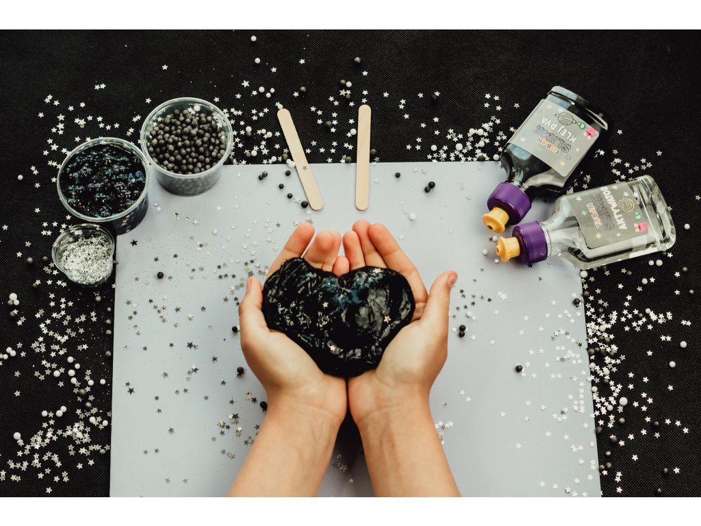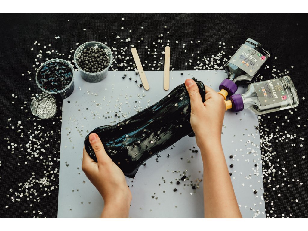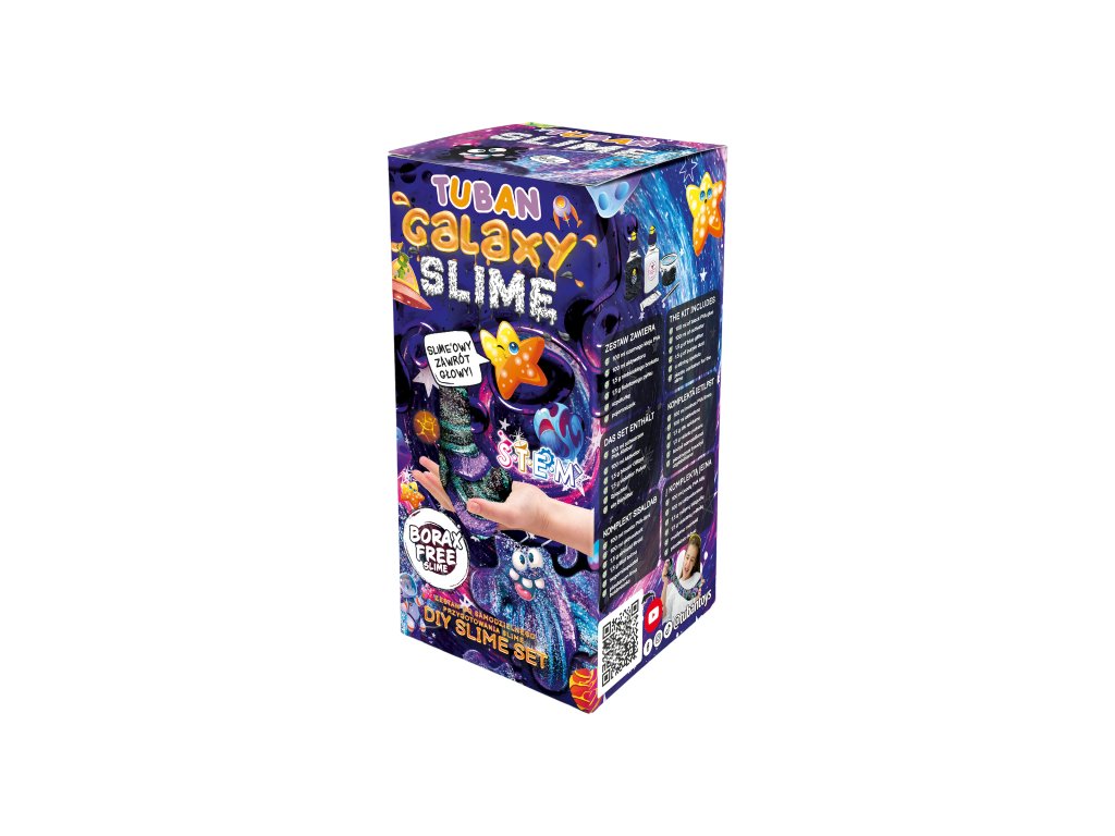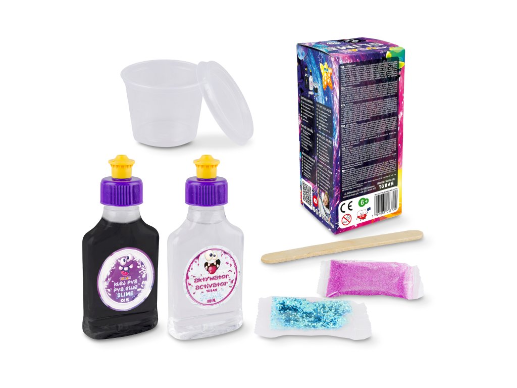 DIY Slime Sada na výrobu slizu Vesmír Vyrobte si svoj vlastný vesmírny galaxy sliz Skvelá aktivita pre deti, ktoré radi experimentujú. V tejto sade nájdete všetko, čo na výrobu kvalitného slizu potrebujete. Vďaka modrým trblietkam a fialovému peľu bude čierny sliz vyzerať ako skuočná galaxia plná malých hviezd. Hra so slizom je ideálna na rozvoj jemnej motoriky, zmyslového vnímania a podporuje u detí kreativitu.Sada obsahuje:100 ml čierneho PVA lepidla,100 ml aktivátora,1,5 g modrých trblietok,1,5 g fialového peľu,špachtľu,nádobu.Zábavný, edukačný, aj relaxačný Pre deti môže byť manipulácia so slizom upokojujúca a relaxačná. Je to skvelý spôsob, ako si oddýchnuť a znížiť stres po náročnom dni. Objavte všetky DIY slizy a hotové Jiggly slimes rôznych farieb a vôní.Sliz je vyrobený z bezpečných a netoxických materiálov, ktoré sú šetrné k životnému prostrediu, neobsahujú borax. Po hre odporúčame sliz uložiť do priloženej nádobky a dobre uzavrieť.Senzorická hra umožňuje deťom objavovať svet okolo seba prostredníctvom zmyslov Hranie s rôznymi textúrami, farbami a vôňami nielenže stimuluje ich zmyslové vnímanie, ale taktiež podporuje ich kognitívny vývoj, jemnú motoriku a emocionálnu inteligenciu. S produktmi značky Tuban môžu deti preskúmavať rôzne senzorické podnety a objavovať nové spôsoby učenia a zábavy.