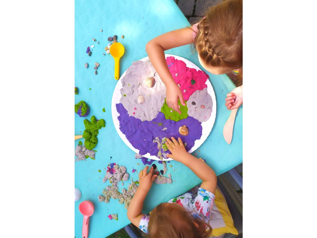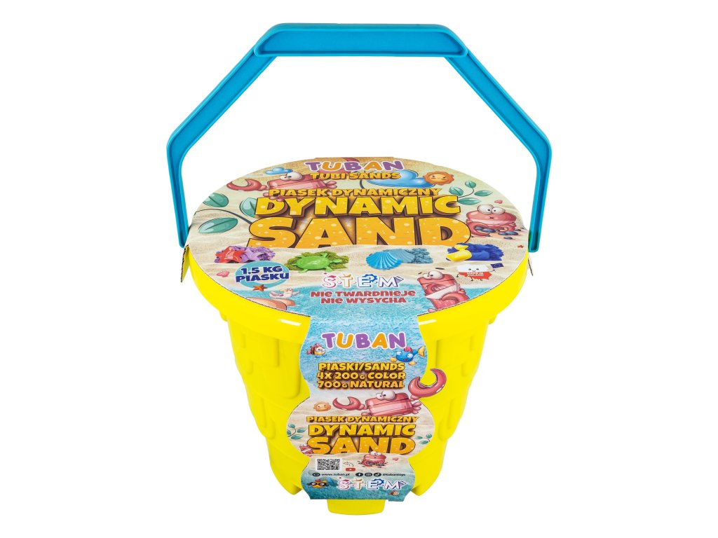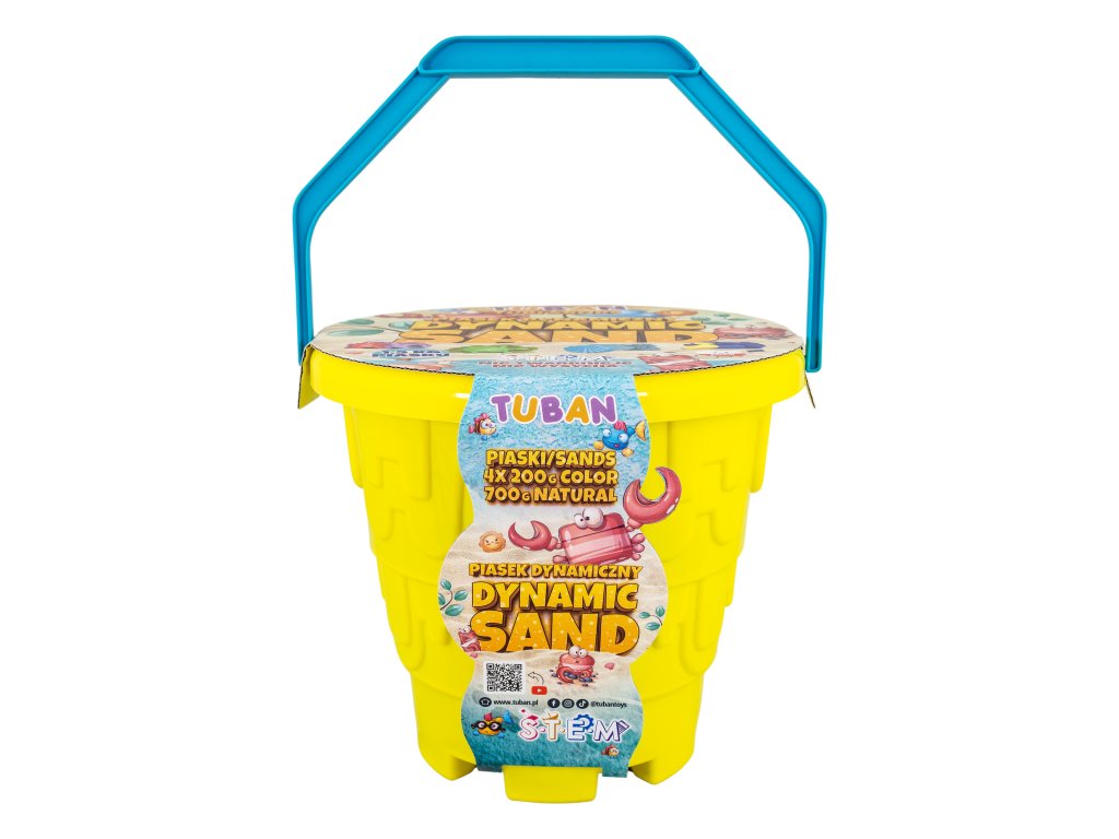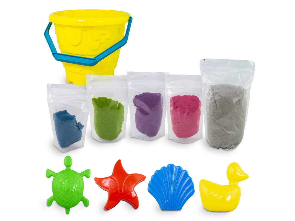 Dynamický piesok Sada v kýbliku Pláž Sada obsahuje až 5 farieb piesku Inovatívny produkt navrhnutý špeciálne pre deti. Dynamický piesok má schopnosť zachovať si tvar a štruktúru bez použitia vody. Je to ideálne riešenie pre deti, ktoré milujú hravú kreativitu, ale aj pre rodičov, ktorí hľadajú bezpečnú a čistú alternatívu k tradičnému piesku. Dynamický piesok sa ľahko tvaruje, nesype sa a nevysychá, takže sa s ním môžete hrať opakovane po dlhú dobu. Je ideálny na rozvoj jemnej motoriky a podporu detskej kreativity.Sada obsahuje:vedierko,4 x 200 g piesku (ružový, modrý, zelený, fialový),1 x 700 g prírodného piesku,4 formičky.Odborník na detskú zábavu Tuban ponúka široký výber kvalitného dynamického piesku a rôznych doplnkov. Dynamický piesok je vyrobený z bezpečných a netoxických materiálov, ktoré sú šetrné k životnému prostrediu, neobsahujú borax.