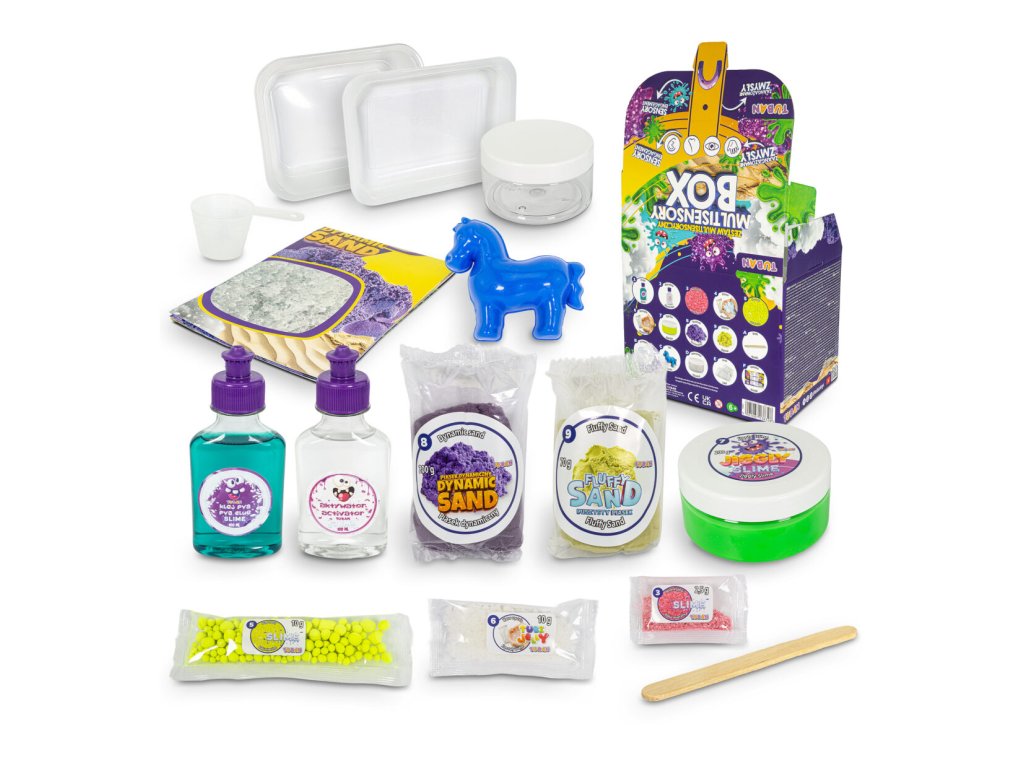Multisenzorický boxObjavte svet dotyku, farieb a zábavy!Predstavujeme Multisenzorický box, ideálny darček pre deti od 6 rokov, ktorý prebúdza zmysly, stimuluje kreativitu a rozvíja jemnú motoriku. Vďaka rôznym materiálom na hranie sa deti učia cez skúmanie a tvorenie — každá ,,hmota“ má unikátnu štruktúru, konzistenciu a vizuálny efekt.Čo všetko tento box obsahuje:sfarbené prísady na výrobu slizu so zábavnými doplnkamidva druhy piesku – dynamický a nadýchaný – na rôzne typy štruktúr a manipuláciuumelý sneh – jemný, fascinujúci na dotykvodové kryštály – zmena formy a interaktívna zábavazákladné príslušenstvo + jednoduchý návod na použitiePrečo si tento box zamilujete?Rozvíja zmysly – dotyk, vizuálne vnímanie, hmatanie rôznych textúrPodporuje jemnú motoriku – formovanie, stláčanie, premiešavanieVyvoláva kreativitu & predstavivosť – deti môžu tvoriť vlastné výtvoryBezpečný materiál – netoxické zložky, bez mikroplastov, testované certifikovanými laboratóriamiVhodné do domácnosti, škôl, terapeutických centierŠpecifikácie:Rozmery balenia: cca 20,5 × 16 × 15,5 cmVekové odporúčanie: od 6 rokov (nebezpečenstvo pre deti do 36 mesiacov – obsahuje malé časti, tekutiny, piesok)Bezpečnostné upozornenie: pod dohľadom dospelej osoby, nejesť, vyhýbať sa kontaktu s očami, v prípade styku – opláchnuť vodou