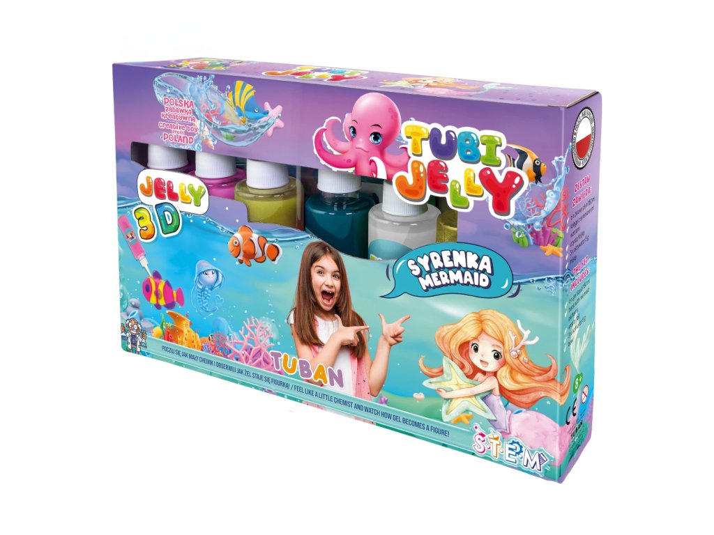 Tubi Jelly Kreatívny set XL Morská panna Vytvorte si 3D gélové figúrky Tubi Jelly set je jedinečná tvorivá sada na tvorbu trojrozmerných figúrok. Set XL obsahuje až 6 farebných gélov. Súčasťou sú taktiež šablóny na kreslenie s motívmi morských panien. Po vyplnení šablóny gélmi ju ponoríte do rozpusteného aktivátora a vaša postavička sa premení na svoju trojrozmernú verziu. Vďaka priloženej prázdnej fólii si deti môžu nakresliť a vytvoriť čokoľvek im napadne.Sada obsahuje:tekutý gél 150 ml v 6 farbách,tematické šablóny,3 x 5 g aktivátora,nádobu na prípravu figúrok.Ocenená hračka roka 2021 V roku 2021 bol produkt Tubi Jelly ocenený titulom Hračka roka v kategórii kreatívne hračky. Vyskúšajte ho aj vy.Všetky produkty značky Tuban sú vyrobené z kvalitných materiálov, sú bezpečné a netoxické, čo znamená, že sa nemusíte obávať o zdravie svojich detí a môžete mať istotu, že ich čakajú len tie najlepšie zážitky.