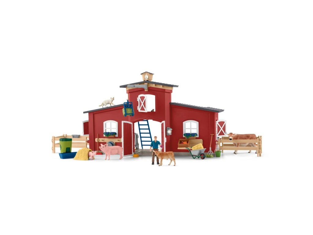 Veľká farma schleich® so zvieratami a príslušenstvom je stredobodom farmárskeho hracieho sveta FARM WORLD! Farma schleich®, vybavená mnohými funkciami a doplnkami, ponúka dokonalý domov pre všetky hospodárske zvieratá. Farmár Paul sa s láskou stará o zvieracích obyvateľov v stajni. Všetky figúrky schleich® sú navrhnuté verne do najmenších detailov, s láskou namaľované a zaručujú výchovne hodnotnú hru. Seno je možné napichovať a nakladať do trakára pomocou vidlíc. Farmu je možné rozširovať modul po module pomocou ďalších sád. Rozmery: 56,5x37,5x10,5cm. Vek: 3+