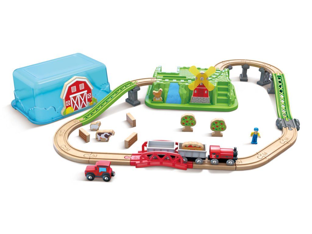 Na farme je toľko práce - mať vlak je výhra! Táto skvelá sada obsahuje množstvo zábavných doplnkov, ako sú kravy, ovce a jablká, ktoré vás zabavia! Táto nádherná sada je dodávaná v úložnom boxe, ktorý sa v skutočnosti môže začleniť do hernej plochy ako stodola. Balenie: 23,5x21,5x32cm. Vek: 3+