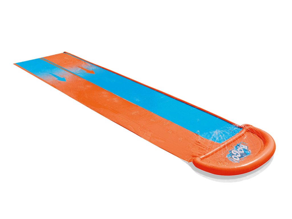 Bestway® H2OGO!® Vodná šmykľavka pre 2 osoby 488 x 138 cm. H2OGO!™ ponúka klasickú letnú zábavu na záhrade. Vďaka dvom dráham môžu deti pretekať na šmykľavke. Zabudované zavlažovače SplashBoost™ s pripojením na záhradnú hadicu vytvárajú kaskádový efekt a udržujú dráhy klzké. Na konci šmýkačky steká voda do bazénika, takže v cieli čaká každého mokrá odmena. Súčasťou šmykľavky je vypúšťací ventil. Deti si užijú hodiny strávené na šmykľavke a rodičia ocenia, aké ľahké je postaviť - stačí ho pripojiť k záhradnej hadici a zábava začína. Vyrobené z odolného UltraSlick™ PVC. Obsah: 1 nafukovacia šmykľavka, 1 opravná sada. Dĺžka šmykľavky: 488 cm. Šírka šmykľavky: 138 cm. Rozmery balenia: 30 x 30 x 5 cm. Používajte výhradne vonku a iba pod dohľadom dospelej osoby. Vek: 3+