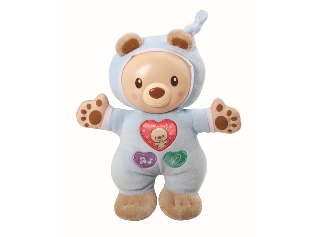 Hebký a mäkký žiariaci medvedík pomôže dieťaťu sa upokojiť a zaspať. Stlačením látkových tlačidiel začuje dieťa rôzne roztomilé vety, hudobné zvuky alebo zvuky prírody. Maznáčik rozvíja motorické zručnosti a zároveň stimuluje sluchové vnemy dieťaťa.