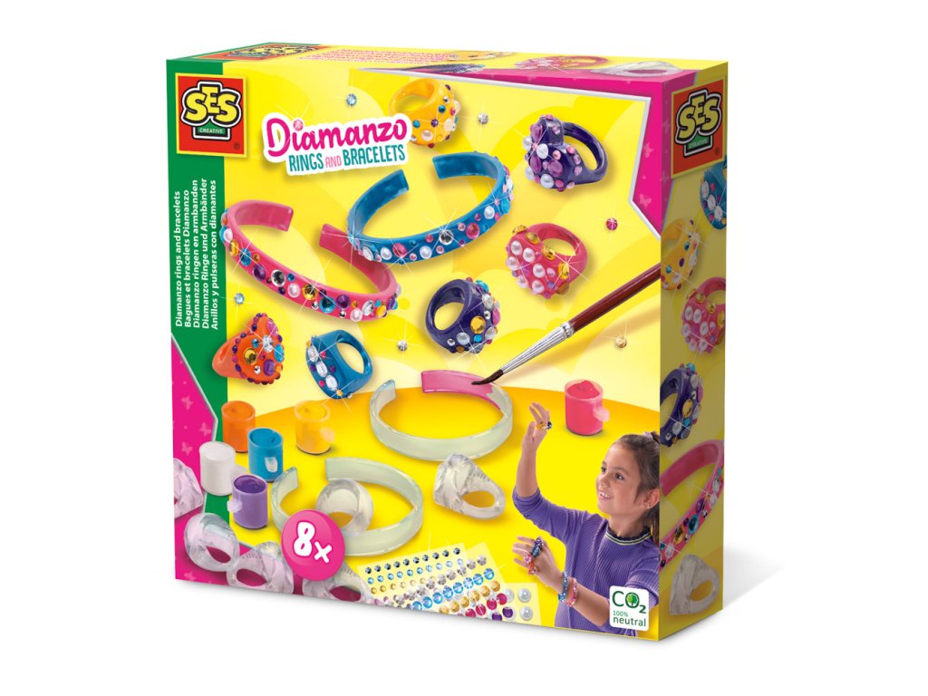 S týmito krásnymi prsteňmi a náramkami Diamanzo určite ukradnete všetku parádu pre seba. Táto sada obsahuje šesť prsteňov a dva náramky, ktoré si môžete ozdobiť, ako chcete. Vyberte si svoju obľúbenú farbu laku a ozdobte šperk rôznymi veľkými aj malými perlami a diamantami. Obsahuje: 6 prsteňov, 2 náramky, 180 kamienkov v 5 farbách, 200 minikamienkov v 5 farbách, 84 perál, 6 farebných lakov, štetec. Vek: 6+
