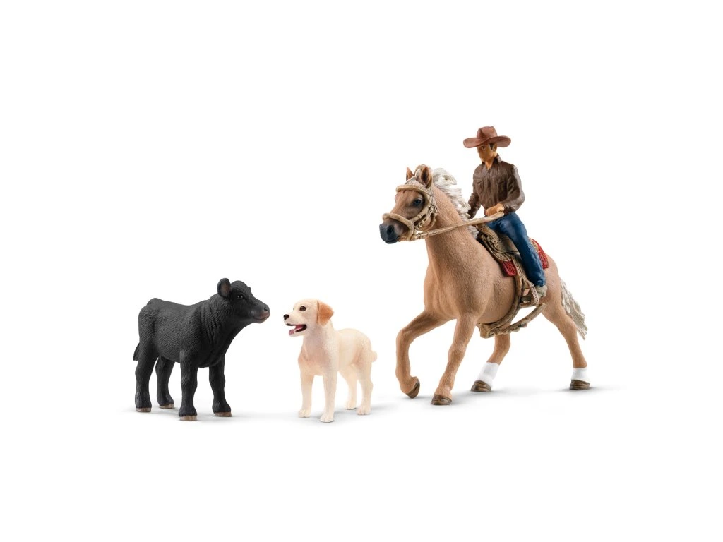 Jíííhááá! Pri jazde vo westernovom štýle vo svete Schleich® FARM WORLD potrebuješ len tých najprofesionálnejších jazdcov. Oťaže držia len jednou rukou. Páni! To preto, že skutočné kovbojky a kovboji potrebujú druhú ruku, aby sa mohli oháňať lasom. Alebo si môžu dať tortu z kaviarne pre jazdcov, zatiaľ čo obratne cválajú po lúke v záhrade. Pri westernovom jazdení mimochodom kôň reaguje na najmenší tlak stehien jazdca. To je dôležité, ak musíš náhle zastaviť z cvalu. To sa môže stať – napríklad keď v obývačke zrazu stretnete iného kamaráta koňa a chcete sa zastaviť na kus reči ohľadom toho, ako bolo minulý týždeň v škole. Sada obsahuje: 1× kovboj, 1× Quarter Horse, 1× uzda a oťaže, 1× westernové sedlo, 1× suka labradora, 1× teľa plemena Black Angus. Rozmery: 15 x 19 x 6 cm. Vek: 3+