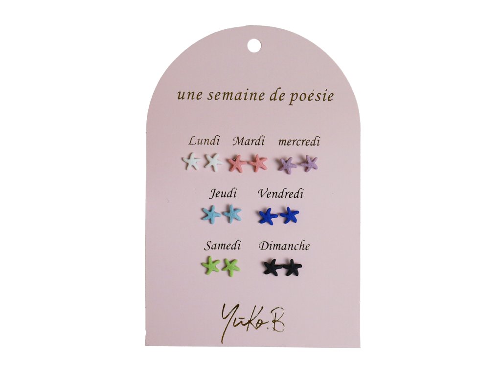 Náušnice na každý deň Hviezdice 7 párov Meň farbu náušníc každý deň! Náušnice Hviezdice v darčekovom balení od francúzskej značky Yuko B. sa stanú jedinečným doplnkom pre deti i dospelých. Všetkých 7 párov náušníc nájdete v jednej darčekovej sade. Náušnice sú vhodné ako malý darček pre všetkých, ktorí milujú byť zladení do posledného detailu.Náušnice Hviezdice z bezpečných materiálov 7 párov náušníc je vyrobených z keramiky a nerezovej ocele, takže neobsahujú žiadne nebezpečné látky a nespôsobujú alergie. Plastický keramický povrch zaisťuje jedinečný vzhľad. Dizajny Yuko B. kombinujú francúzske aj svetové trendy. Dôležitá je pre značku aj kvalita a minimálny dopad na životné prostredie.