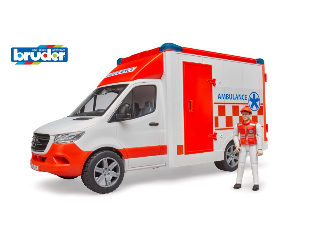 Priekopnícky, efektívny, spoľahlivý – tak Mercedes Benz opisuje nový Sprinter. Aj v najnovšej generácii zostáva všestranným a všeobecne obľúbeným dopravným profesionálom. Rad záchranných vozidiel teraz doplnila nová sanitka MB Sprinter. Pokiaľ dôjde na záchrannú misiu, nesmie chýbať toto vozidlo, ktoré je vybavené množstvom funkcií. Zdravotník, ktorý je súčasťou dodávky, nastupuje do kabíny vodiča otvárateľnými dverami. Vďaka novému integrovanému svetelnému a zvukovému modulu s rôznymi sirénovými signálmi a svetelnými funkciami sa sanitka dostane na miesto udalosti rýchlo a bezpečne. Malý záchranár má prístup do ultramoderného ošetrovacieho priestoru otváracími zadnými dverami a bočnými dverami a taktiež odnímateľným strešným modulom. Na výškovo nastaviteľných nosidlách, ktoré je možné vytiahnuť a zase zasunúť, je priestor pre každú figúrku bworld na ošetrenie a je možné ich bezpečne prepravovať. Mierka: 1:16. Batérie: 3 x AAA sú súčasťou výrobku. Rozmery auta: 45,5 x 17 x 22 cm. Rozmer balenia: 19,5 x 27 x 52 Vek: 3+