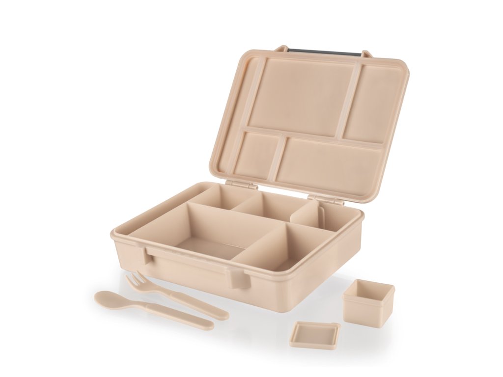 Vďaka viacerým priestranným priehradkám rôznych veľkostí (500 ml, 330 ml, 220 ml, 150 ml a 130 ml) môžete pripraviť pestrý a vyvážený obed so sebou. Malá nádobka na omáčku a integrovaná vidlička s lyžičkou sú samozrejmosťou.