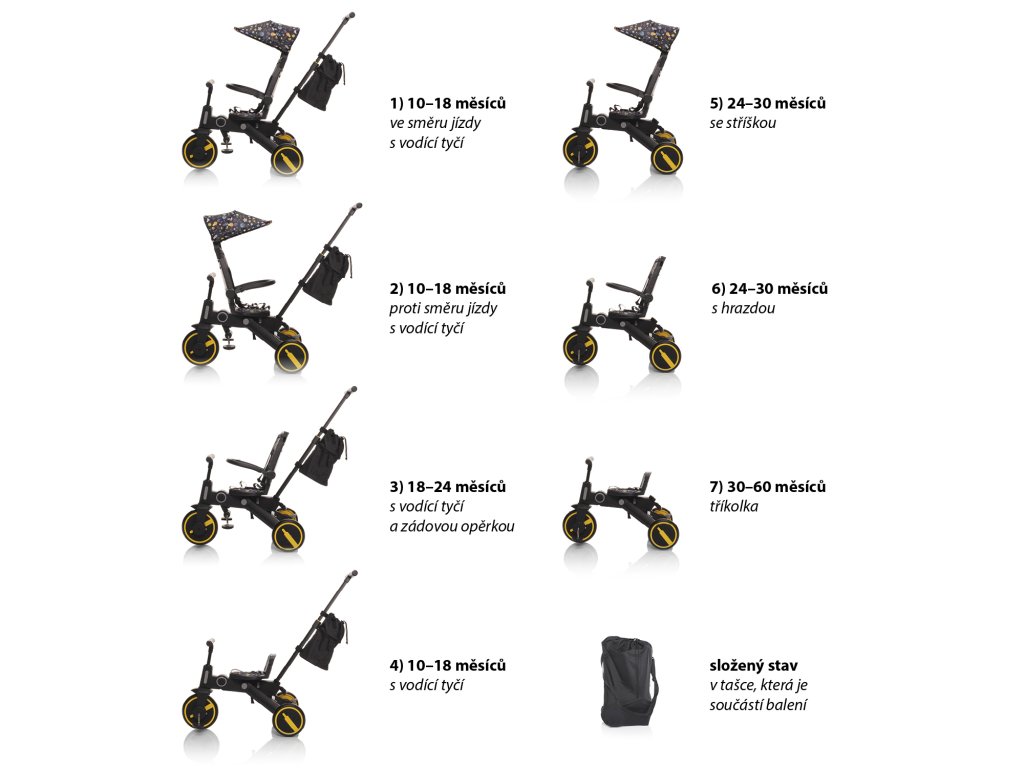 • Variabilná trojkolka, je možné využiť až 7 spôsobmi