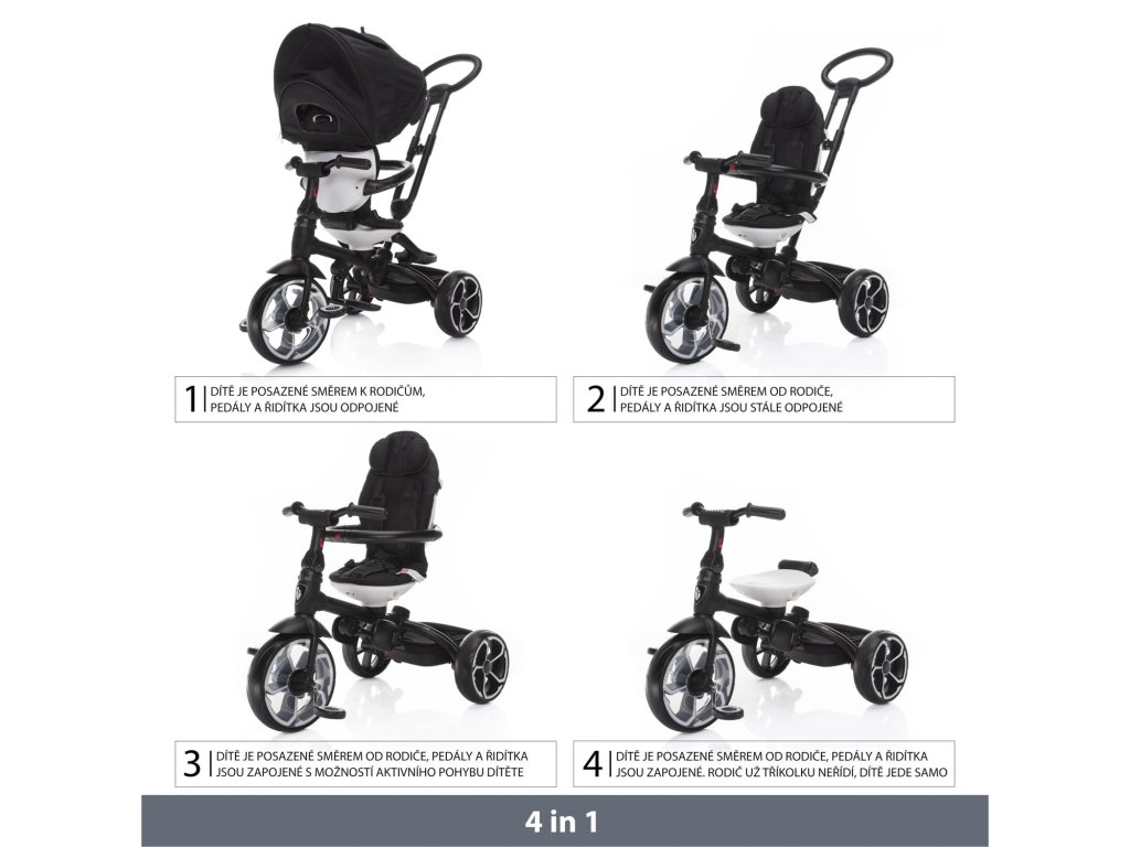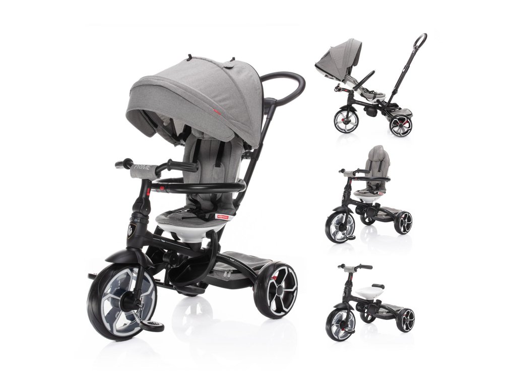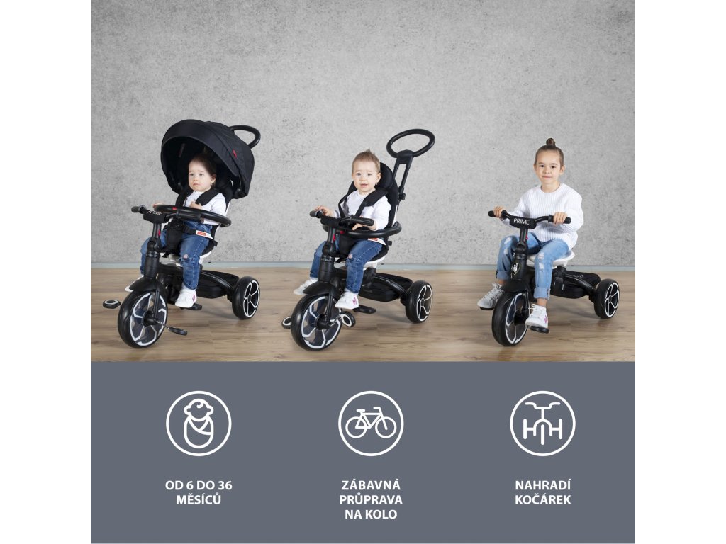 S tým, ako dieťa rastie a vaše potreby sa menia, trojkolka Prime ponúka možnosť 4 režimov použitia. V 1. režime je dieťa posadené smerom k rodičovi, pedále a riadidlá sú odpojené. V 2. režimu je dieťa naopak smerom od rodiča, pričom pedále a riadidlá sú stále odpojené. 3. režim ponúka to, že dieťa sedí smerom od rodiča, pedále a riadidlá sú zapojené s možnosťou aktívneho pohybu dieťaťa. A v poslednom – 4. režime, sedí dieťa obrátene, smerom od rodiča, pedále a riadidlá sú zapojené. Rodič už trojkolku neriadi, vodiaca tyč je odobratá a dieťa ide úplne samo.