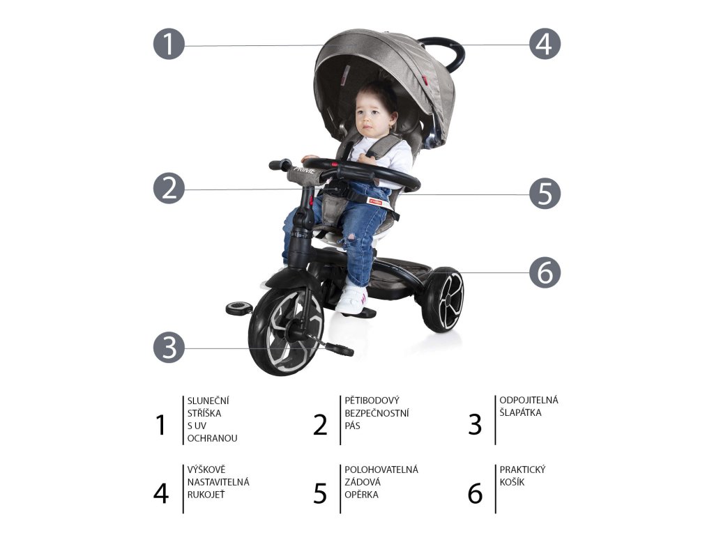 Pri vývoji tohto neprehliadnuteľného dopravného prostriedku sme nemysleli samozrejme len na pohodlie malého pasažiera, ale aj na vás, rodičov. Rukoväť trojkolky je preto nastaviteľná tak, aby sa mohla prispôsobiť vašej výške. Ľahko odpojiteľné pedále a riadidlá pritom zaistí pasívnu pozíciu dieťaťa a trojkolku riadite len vy.