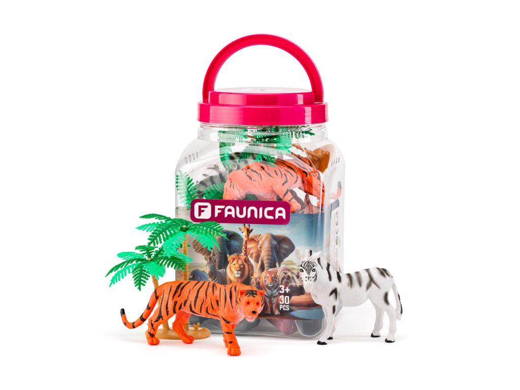 Tuba plná divokých zvierat, ktoré deti dobre poznajú, doplnená príslušenstvom (stromy, kamene, kmene)| Vek: 3+ | Dĺžka nosorožca: 12 cm